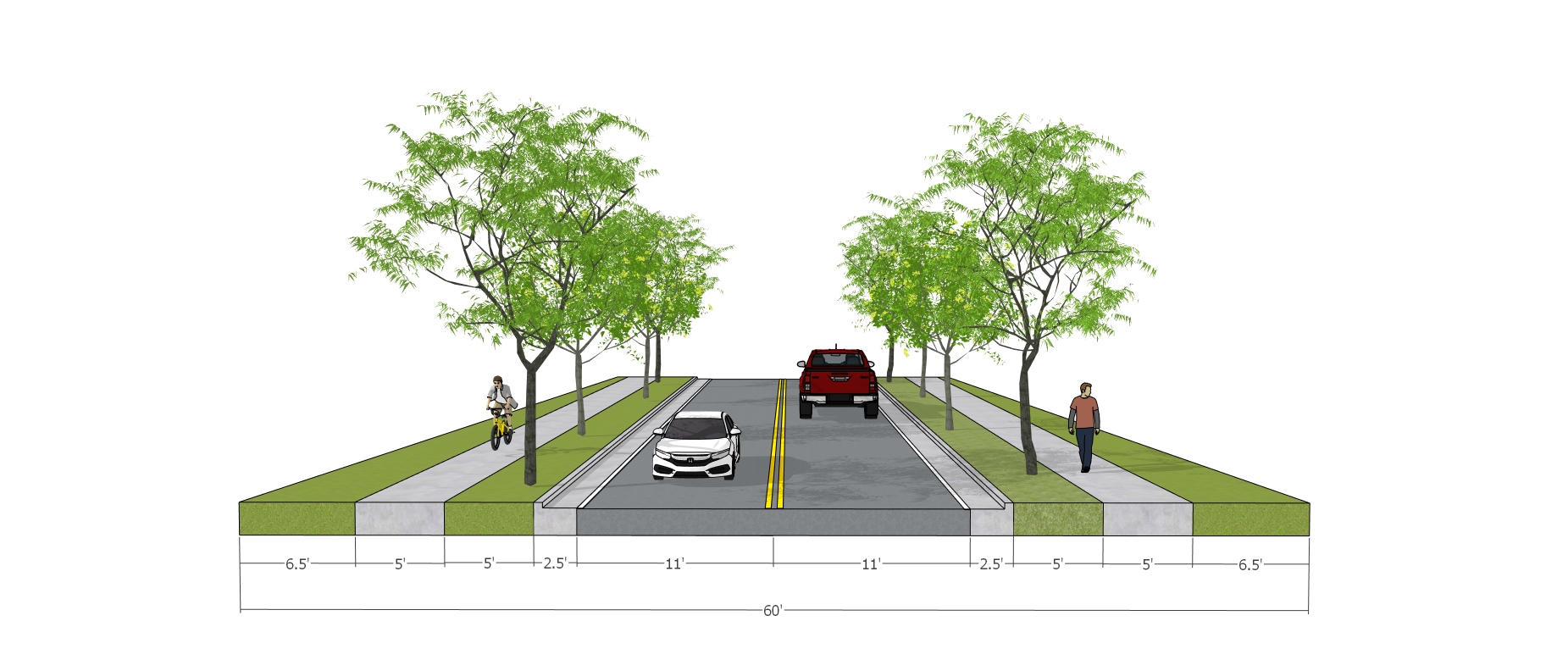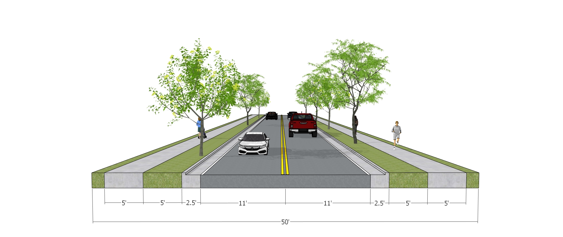 Local streets have lane widths that range from 9'-12' based on speed and volume. For local streets without a curb and gutter, the graded shoulder should be a minimum of 2'. Rural local streets most often will not warrant bicycle and pedestrian facilities. The recommended speed limit is 25 mph, and the maximum daily capacity is up to 9,100 vehicles.